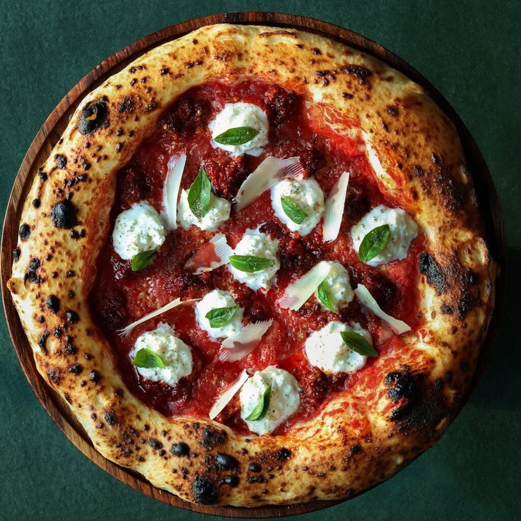 At La Panthera, pizza isn’t an afterthought – it’s a statement. Each one begins with a 48-hour fermented dough, hand-shaped and fired in a wood oven until the crust blisters and bubbles perfectly. The result? A crust that’s pillowy yet crisp, deeply flavourful, and unmistakably alive – the hallmark of true wood-fired pizzas.